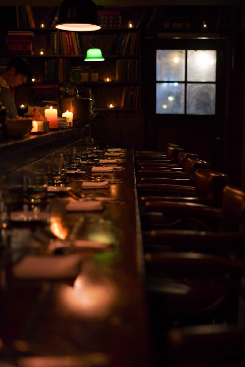 アンティーク調の照明とキャンドルの光が、心地よい陰影を描き、カウンター越しにはオープンキッチンから漂う食材やソースの香り。